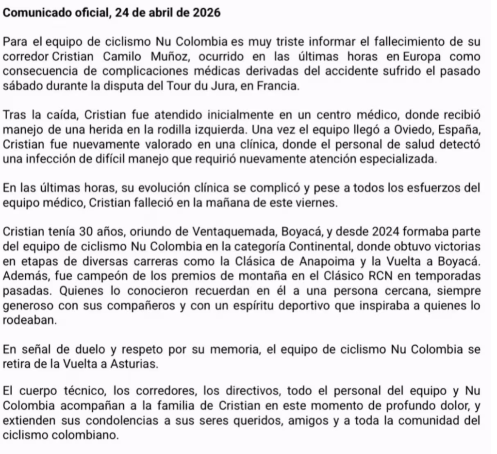 “Para el equipo de ciclismo Nu Colombia es muy triste informar el fallecimiento de su corredor Cristian Camilo Muñoz, ocurrido en las últimas horas en Europa como consecuencia de complicaciones médicas derivadas del accidente sufrido el pasado sábado durante la disputa del Tour du Jura, en Francia”.
